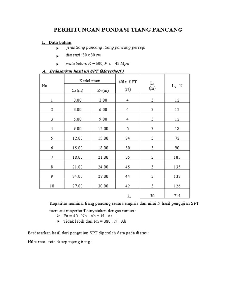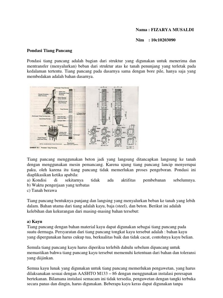 Pondasi tiang pancang sipilpedia sumber : Bahan untuk pondasi tiang pancang adalah : Kebanyakan penampang tiang pancang baja berbentuk profil h, karena terbuat dari beban baja. Dibuat pada bagian yang terpisah (dibawah kolom pendukung/ kolom struktur, tiang, dan sebagainya), juga biasa digunakan pada konstruksi bangunan kayu di pondasi umpak, dipakai untuk bangunan sederhana. Namun ada juga yang berupa tiang pancang baja profil kotak. .kondisi aman.pondasi tiang merupakan type pondasi yang sering digunakan pada stuktur bangunan yang membutuhkan daya dukung yang sangat. Antara tiang dihubungkan dengan balok kayu di pile dapat terbuat dari bahan kayu, besi/baja, beton atau kombinasi diantaranya, tergantung dari berat pondasi caisson; Di video ini saya tampilkan pemasangan pondasi untuk tiang baja ringan.tiang ini di pasang untuk pagar kebun. Adalah tiang pancang yang terbuat dari bahan baja yang bentuknya dapat berupa profil atau pipa. D deeww contoh laporan tugas teknik rekayasa pondasi sumber : Tiang pancang sebagai pondasinya yang utama disebut juga sebagai reinforced concrete pile, yaitu material beton bertulang. Type pondasi tiang dikelompokkan berdasarkan fungsi tiang, material dan cara pelaksanaannya. Pondasi tiang pancang dibuat ditempat lain (pabrik, dilokasi) dan baru dipancang sesuai dengan umur beton setelah 28 hari.